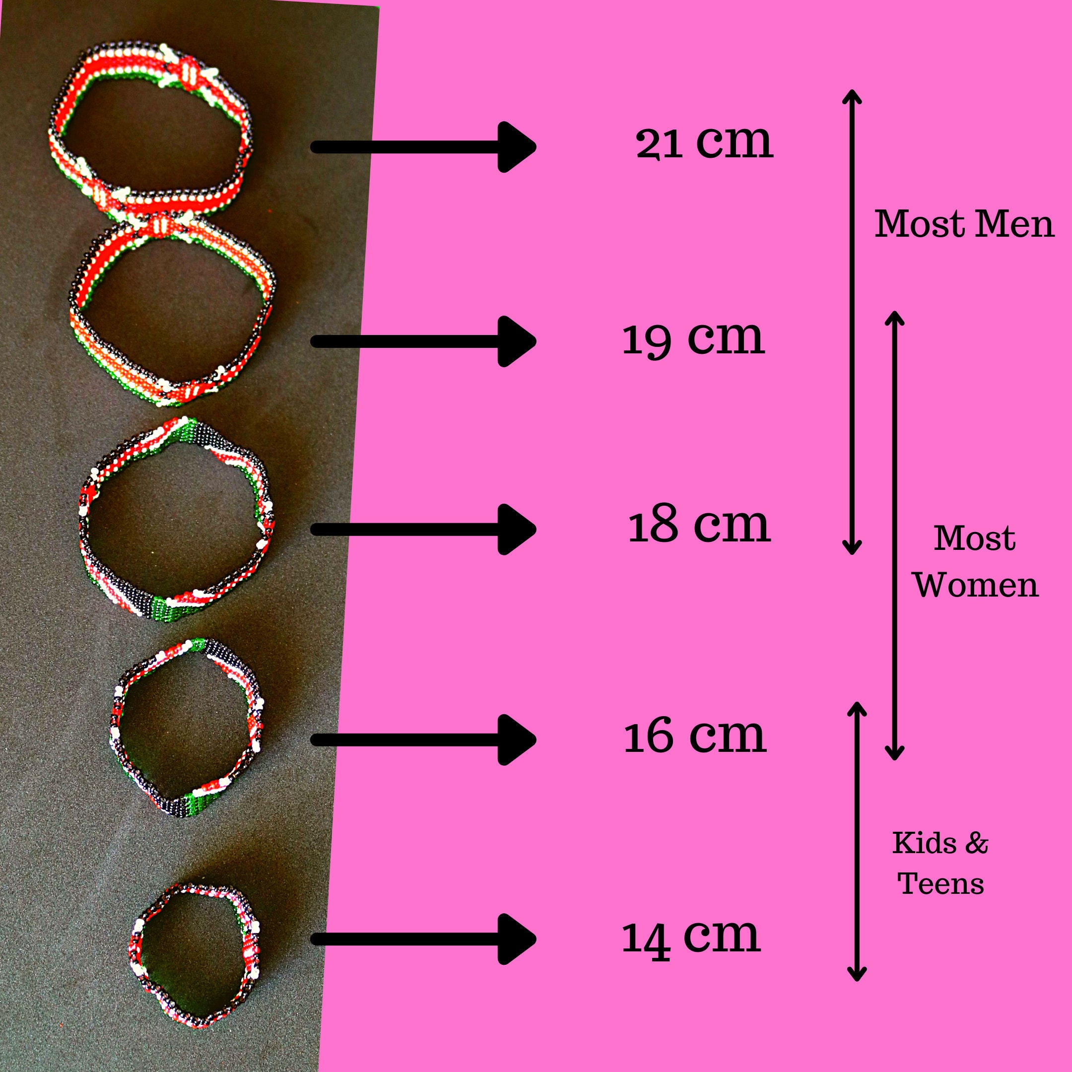 SIZE : The size is measured as the circumference around the inside of the bracelet. Measure the distance around your wrist to find your size. Available in up to multiple sizes for length ranging from 14 cm to 21 cm. The width of the bracelet is 1.5 cm. The bracelet is a snug fit and does NOT stretch. For a loose fit, order a size up. To measure your wrist size, use a strip of paper cut from the short side of an A4 size paper. The paper strip should be about 21.5 cm long. Tie the strip around your wrist at the bottom of your palm and mark your size. Measure against a ruler .